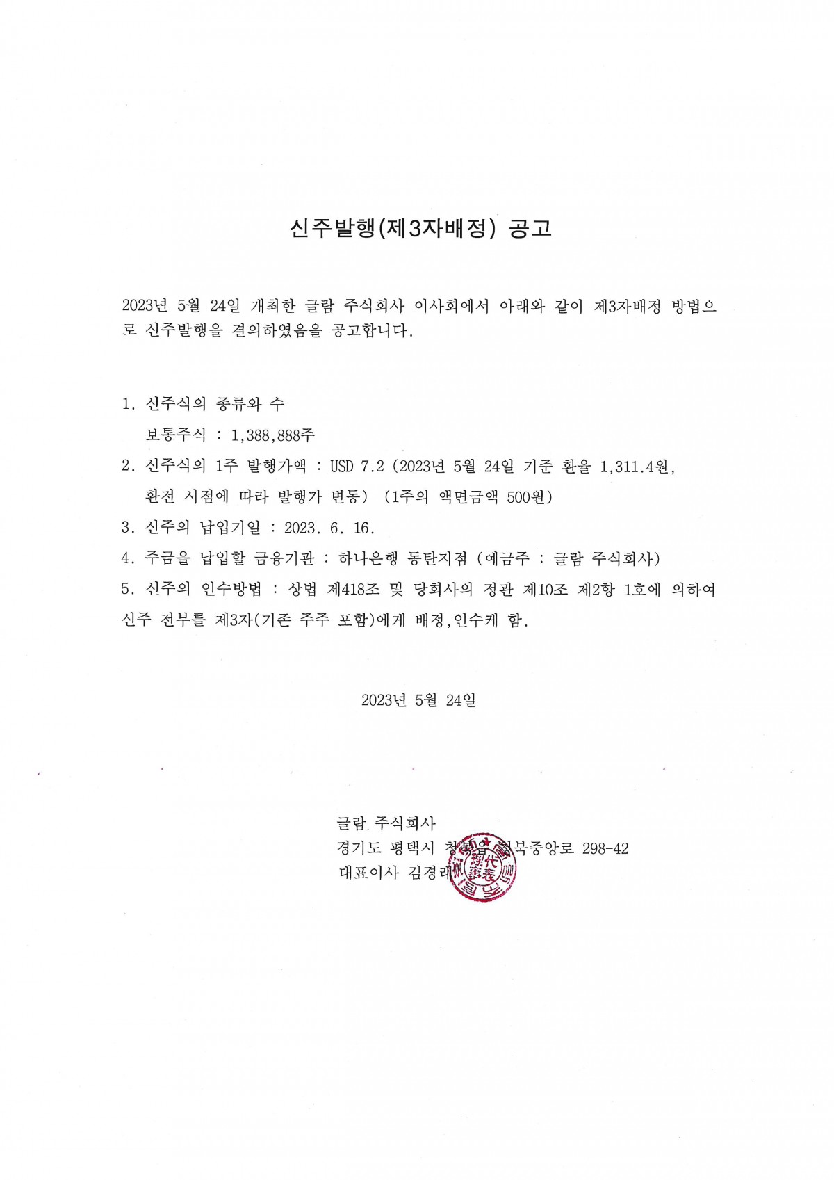 신주발행 ( 3자배정 ) 공고 2023-05-24