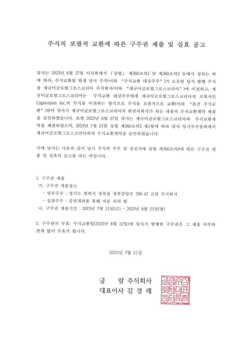 주식의 포괄적 교환에 따른 구주권 제출 및 실효 공고