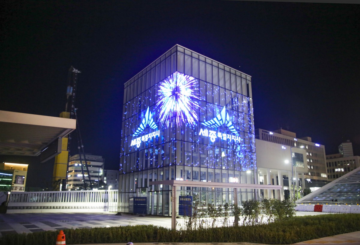 세종시 도시상징광장에 설치된 국내 최대 규모의 4면 ‘스마트 미디어 큐브’ /사진제공=글람